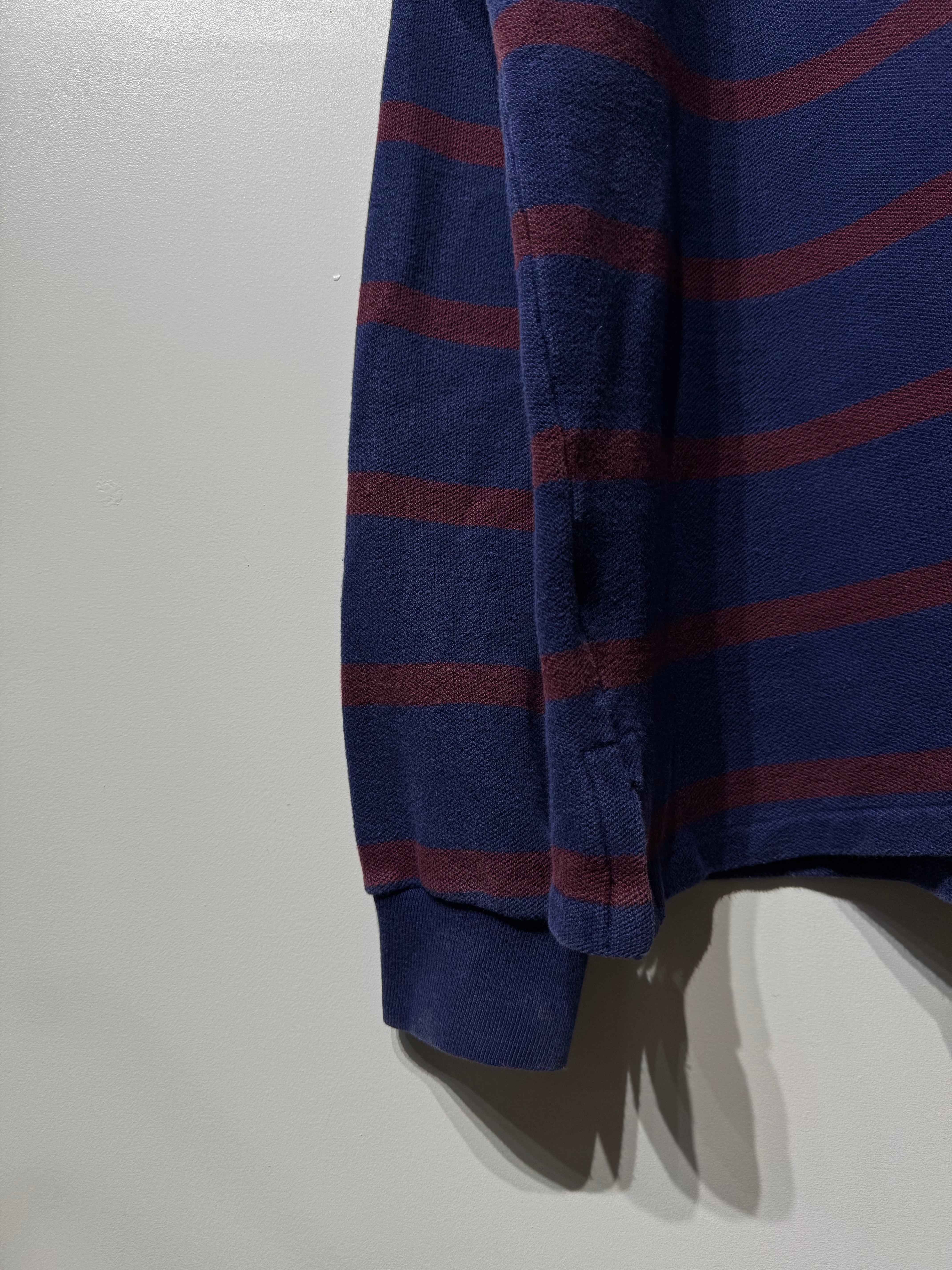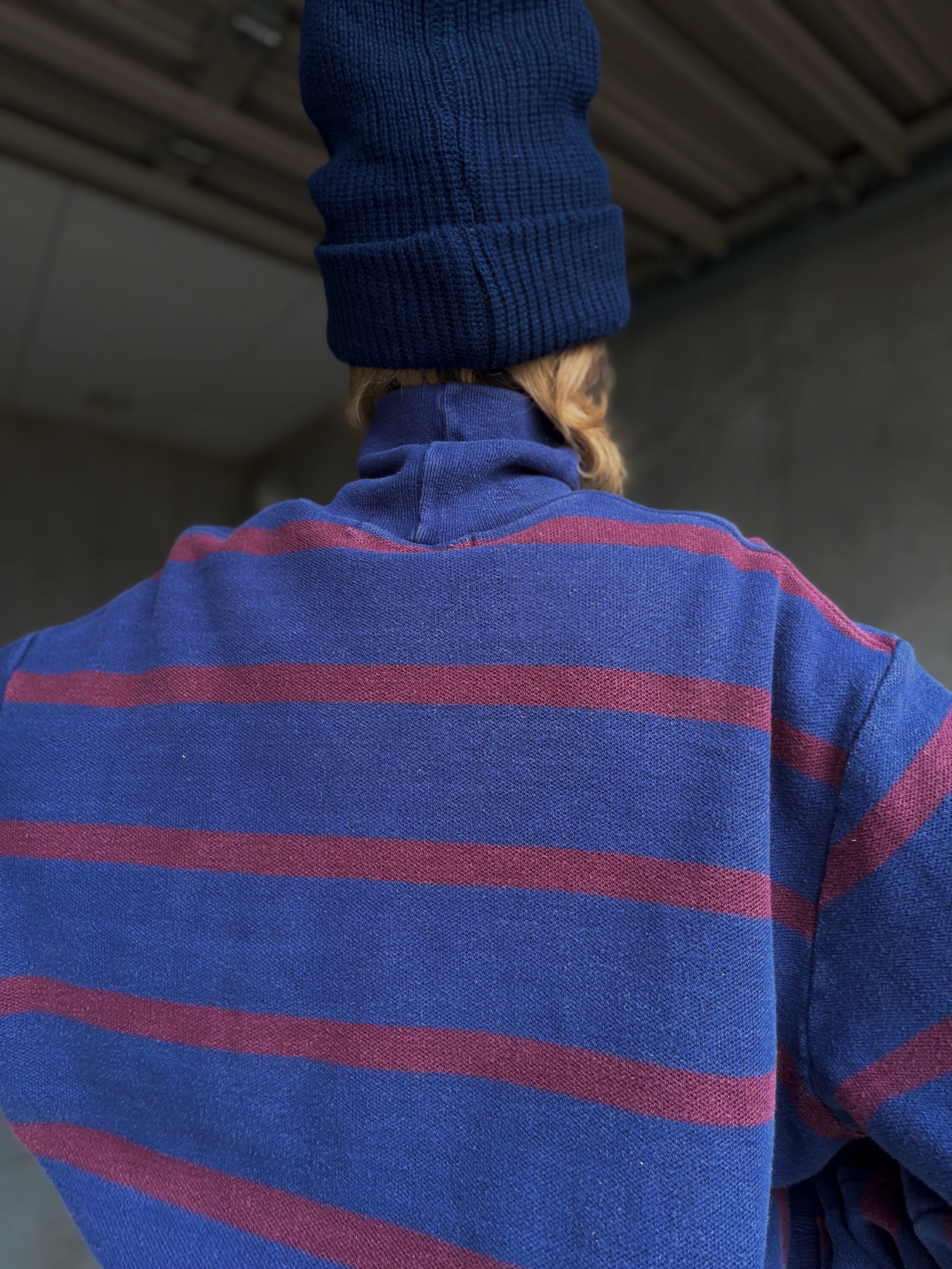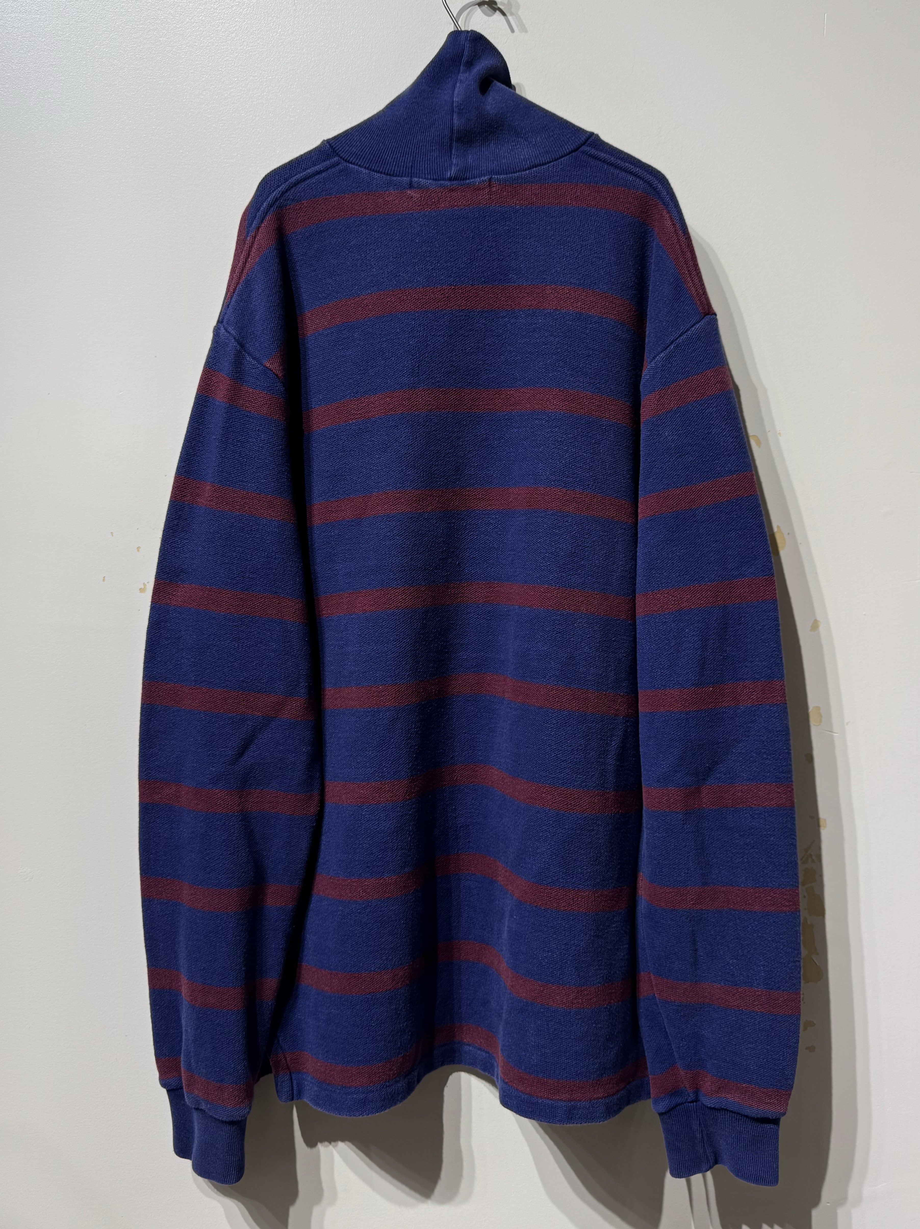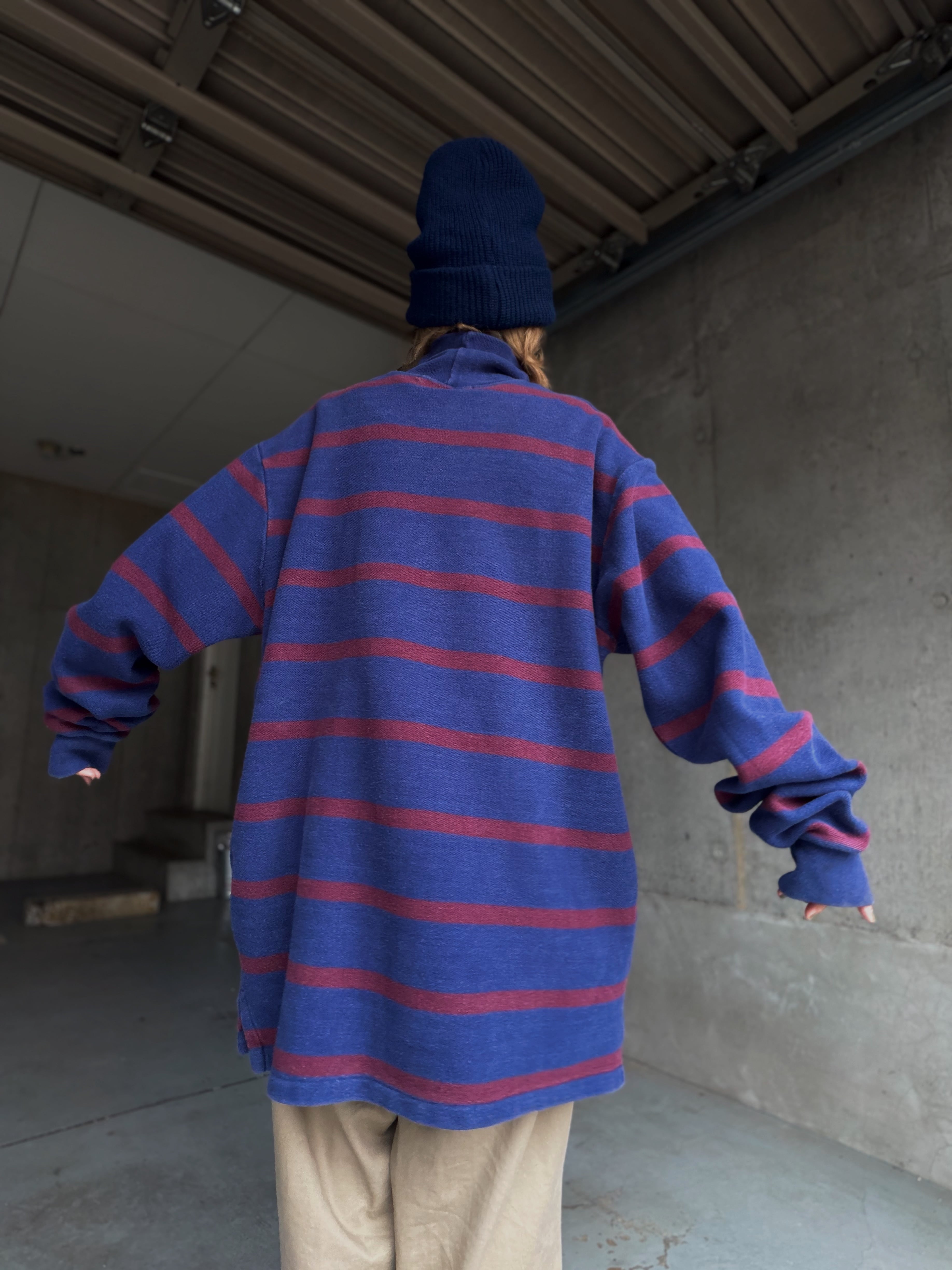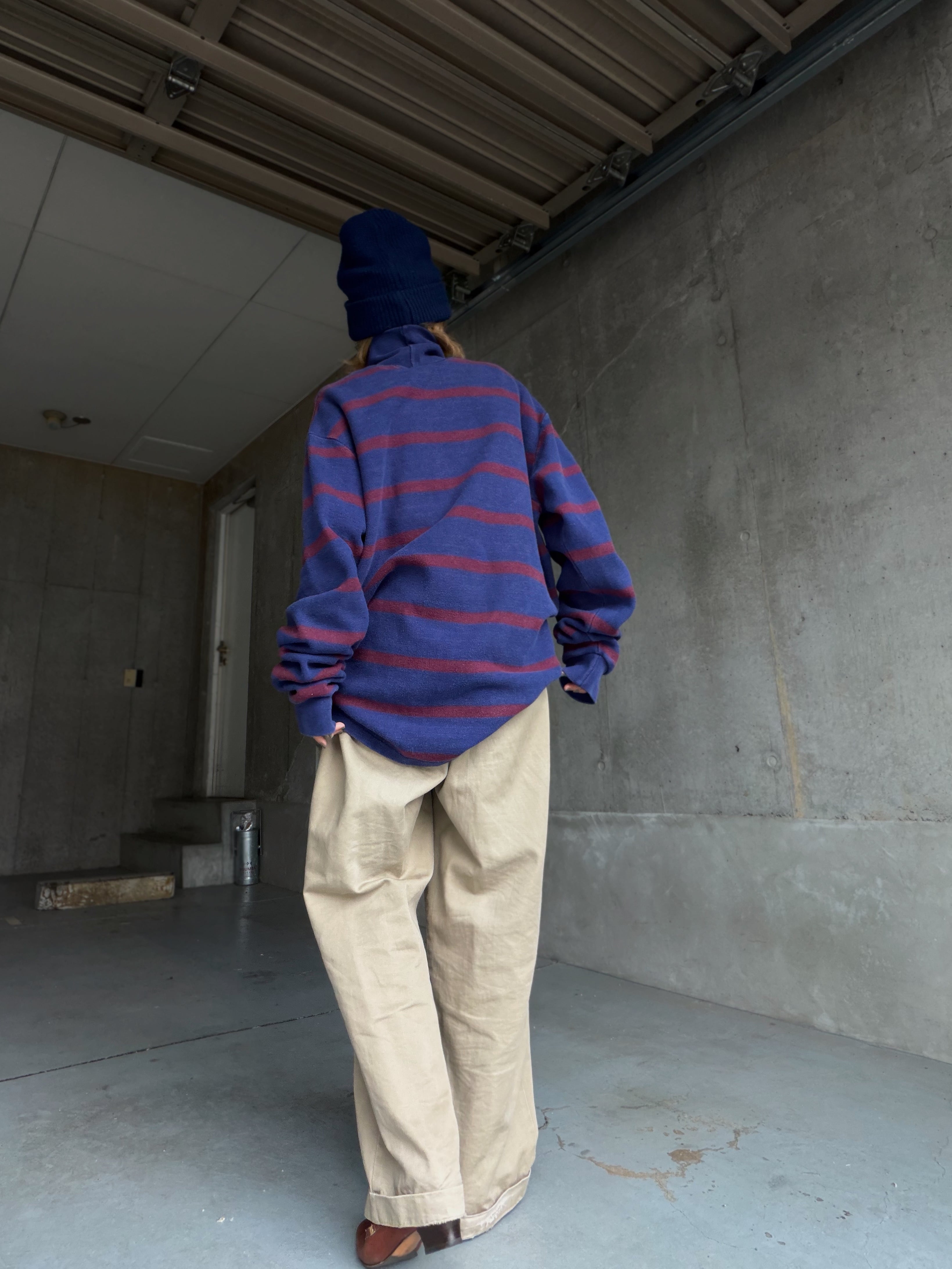 ネイビーにバーガンディボーダーですが、厚手だからこそ生地に程良いアタリやフェード感が出てるのも良い。