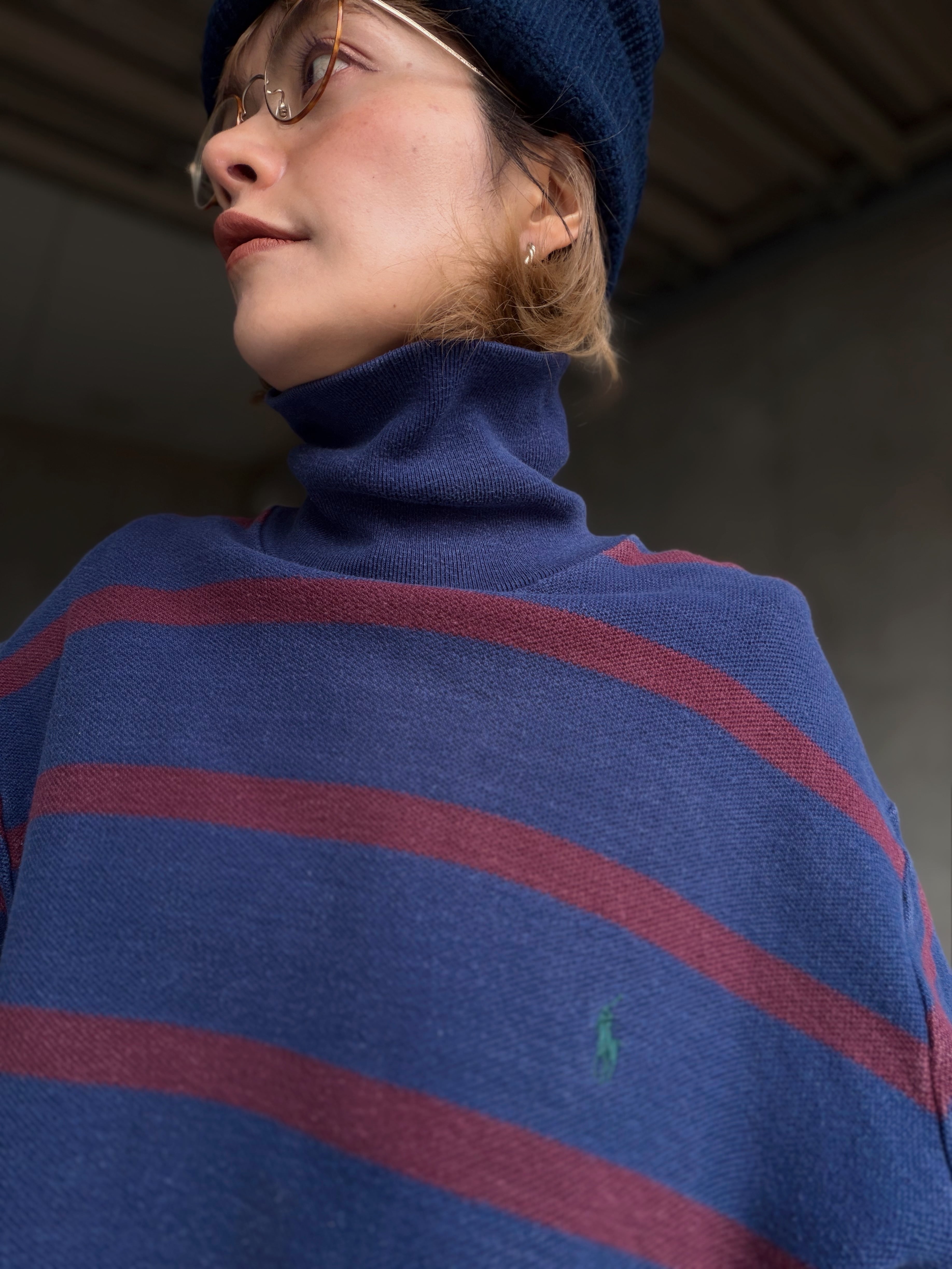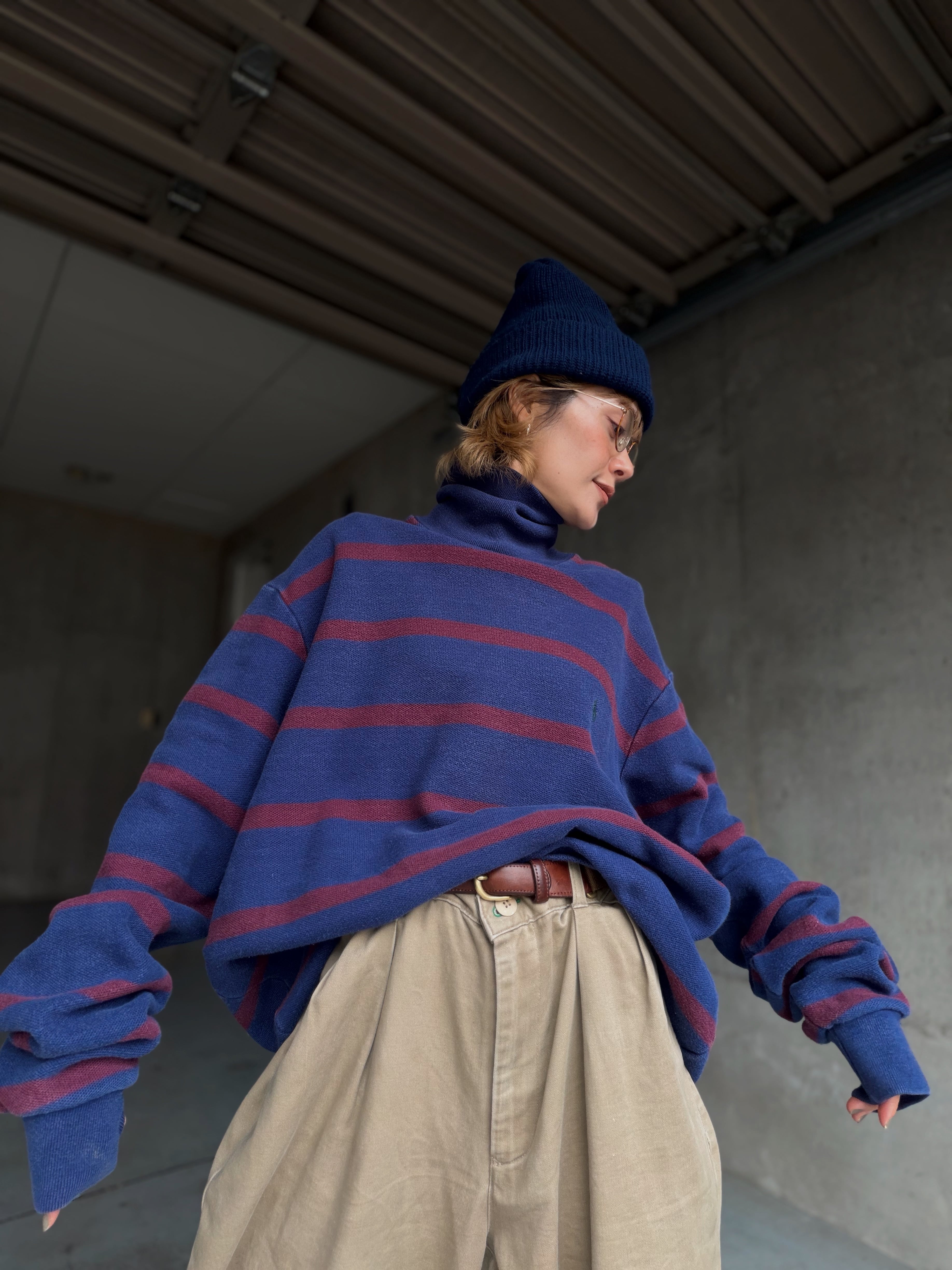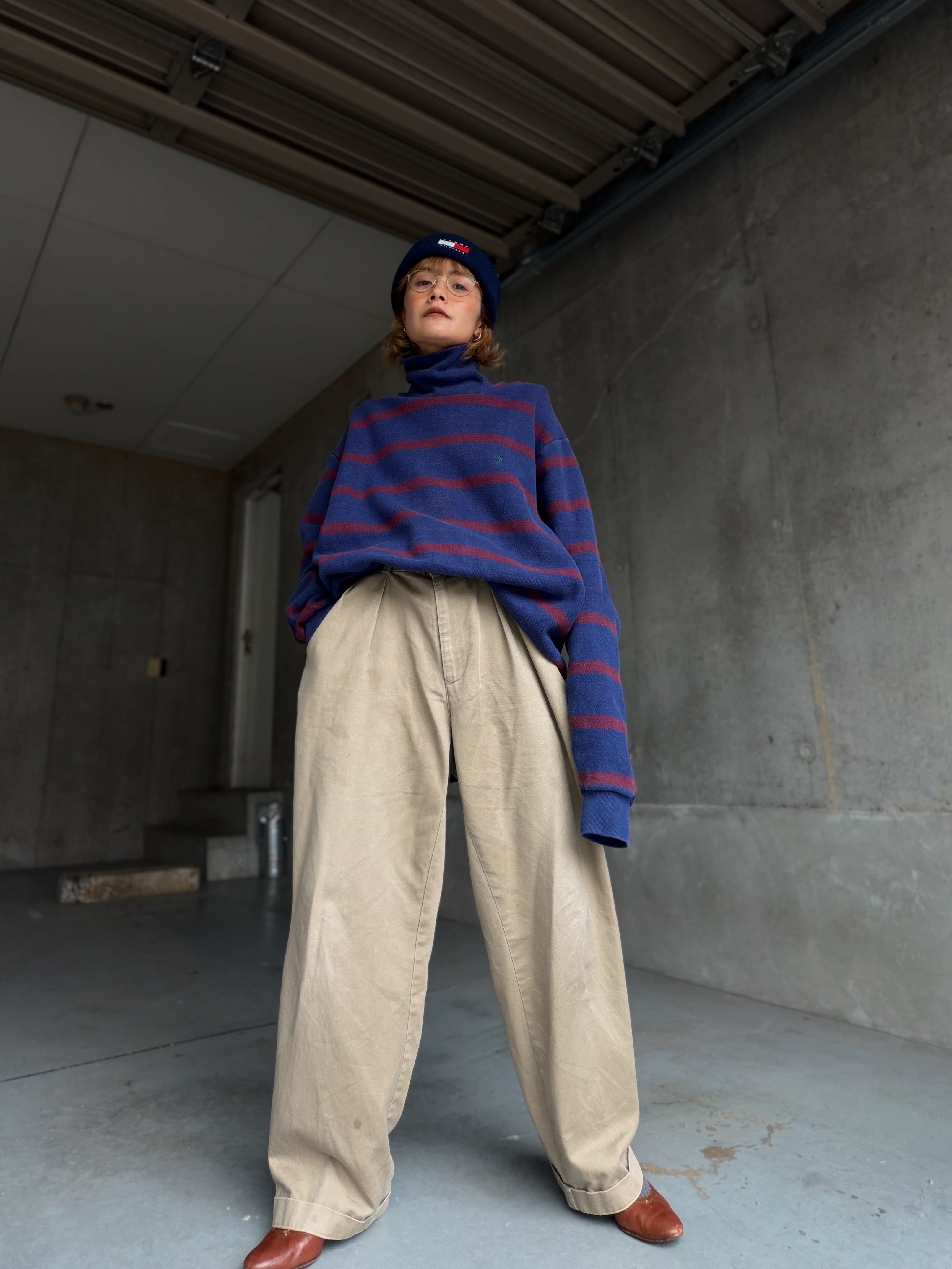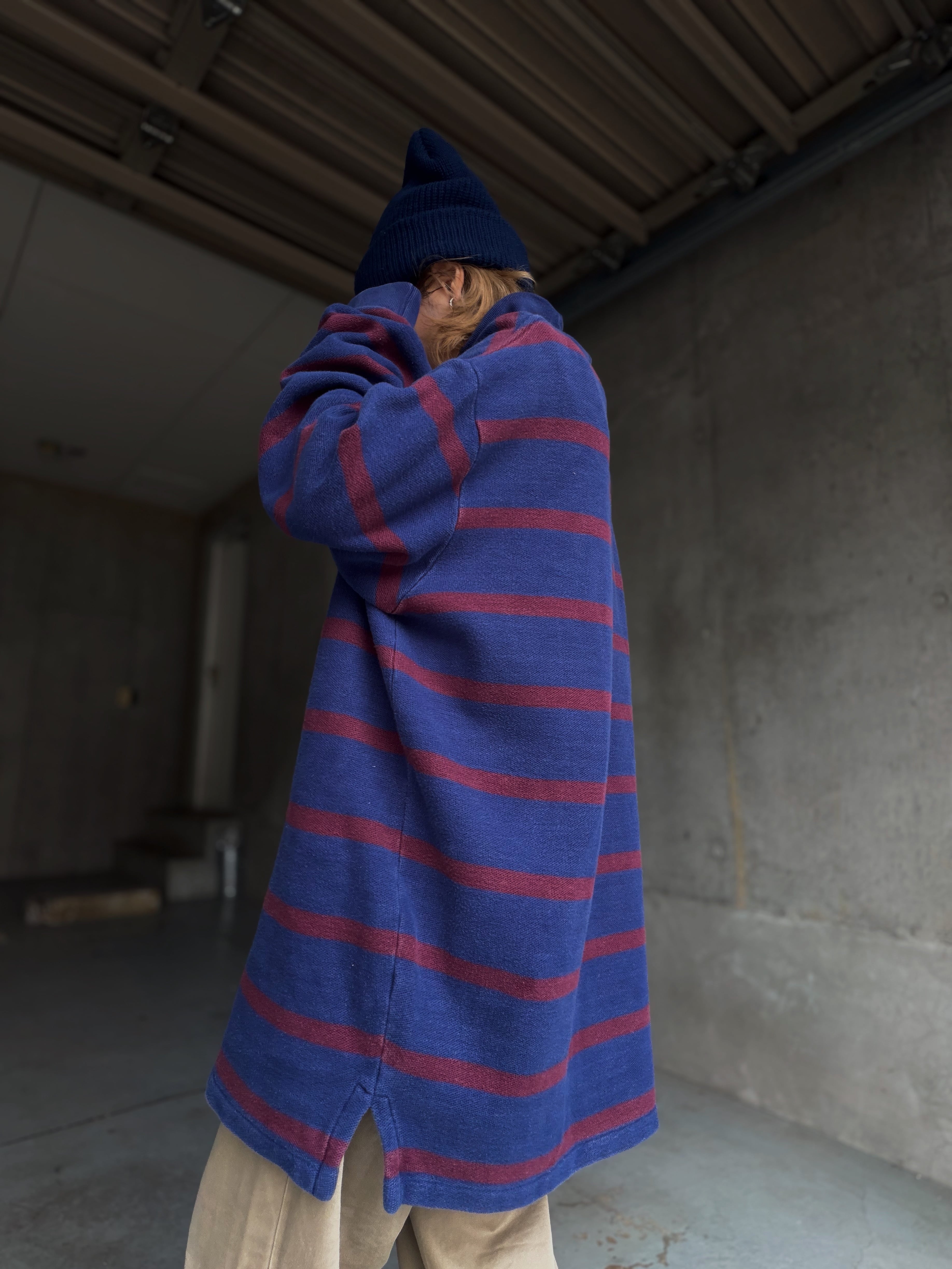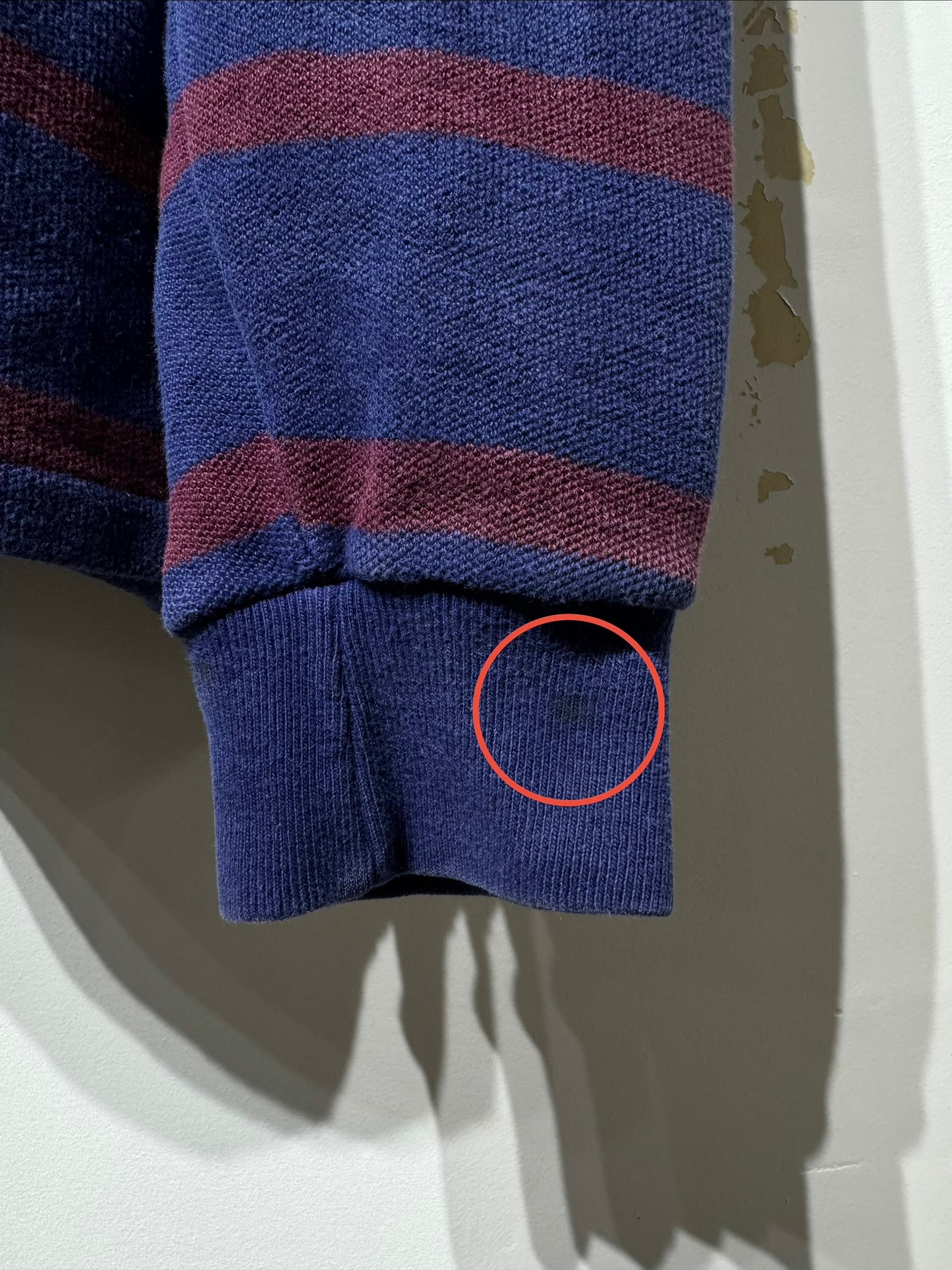 ネイビーにバーガンディボーダーですが、厚手だからこそ生地に程良いアタリやフェード感が出てるのも良い。